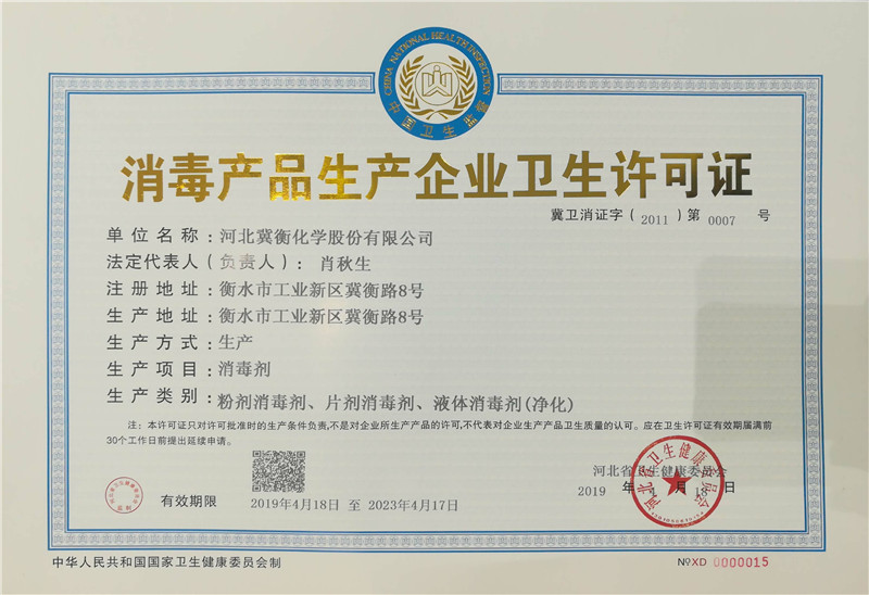 近日,河北省衛生健康委員會批準了我公司衛生許可證的延期申請書,新的《衛生許可證》有效期限到2023年4月17日。